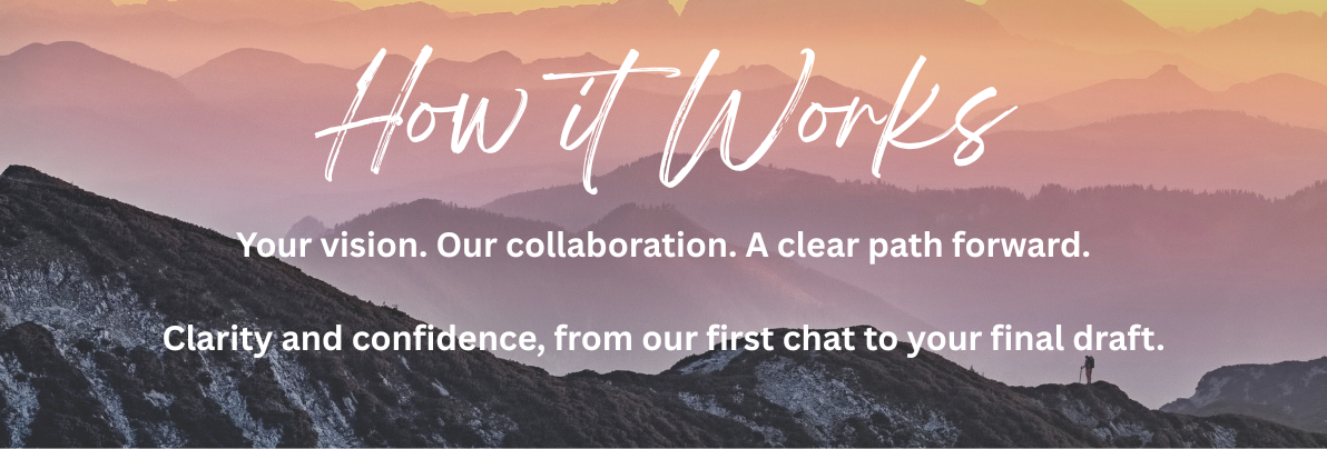 Once you decide to move forward, we'll sign a clear and straightforward contract, and a deposit will be made to secure your spot. I will then send you an introductory survey to complete. This is a valuable tool for you to organize your thoughts and for me to understand your goals, concerns, and hopes for the manuscript before I begin my work.